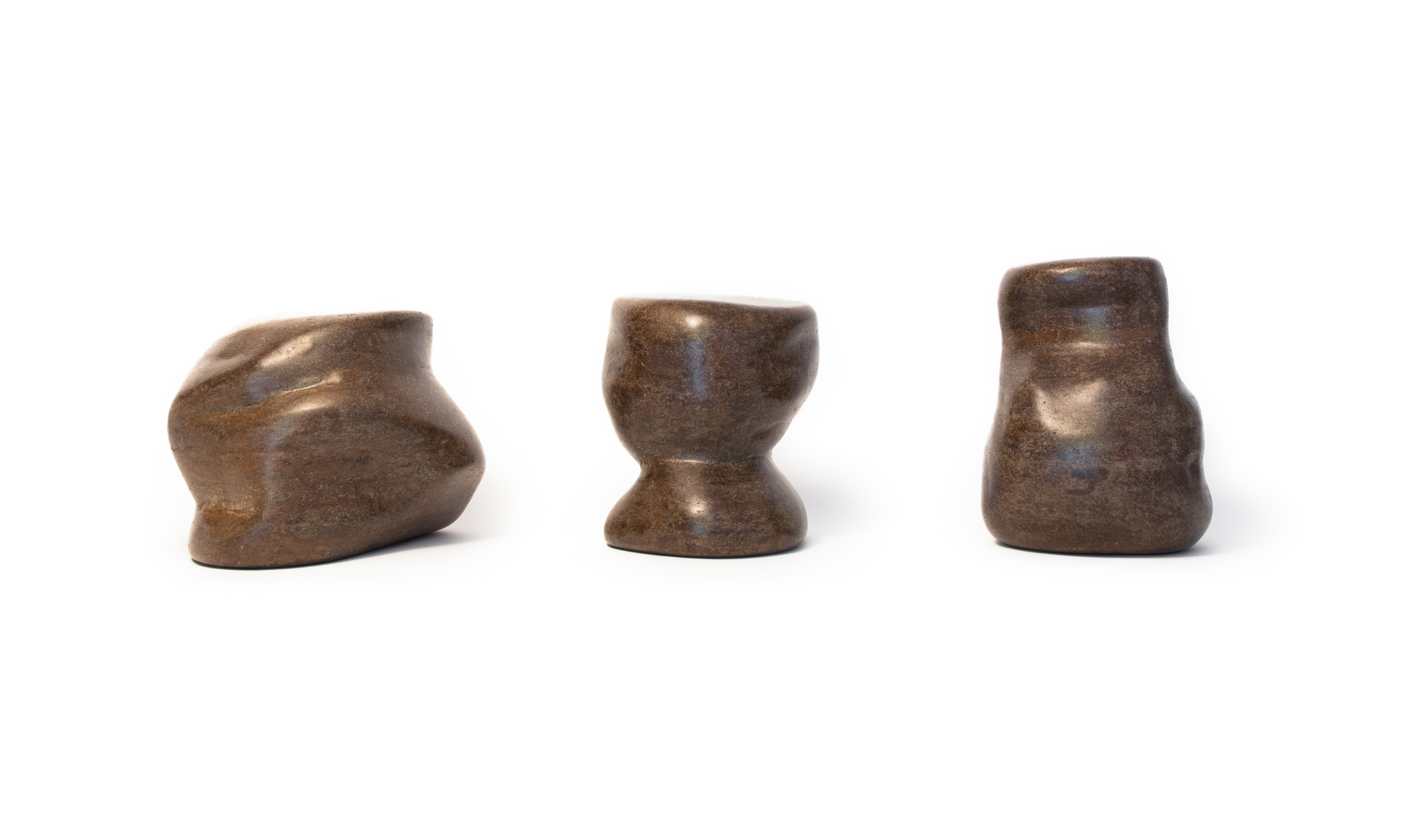 These solid paper stools are cast from 100% recycled corrugated cardboard pulp and finished with natural dyes, tung oil and beeswax. The project originated from our interest in re-purposing post-consumer waste. We also studied several precedents: Ray Eames’ walnut stools from 1959, Frank Gehry’s 1972 Wiggle Stool, and traditional African stools. Initially shaped by hand, we used digital processes to derive the final shapes and to produce the water-jet cut aluminum molds to cast the stools. As did its precedents, Three Stools (Samples) can be used as seating, side tables and art objects.
